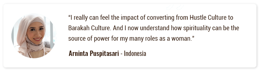 "I really can feel the impact of converting from Hustle Culture to Barakah Culture. And I now understand how spirituality can be the source of power for my many roles as a woman." — Arninta Puspitasari, Indonesia