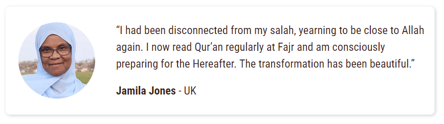 "I had been disconnected from my salah, yearning to be close to Allah again. I now read the Quran regularly at Fajr and am consciously preparing for the Hereafter. The transformation has been beautiful." — Jamila Jones, UK